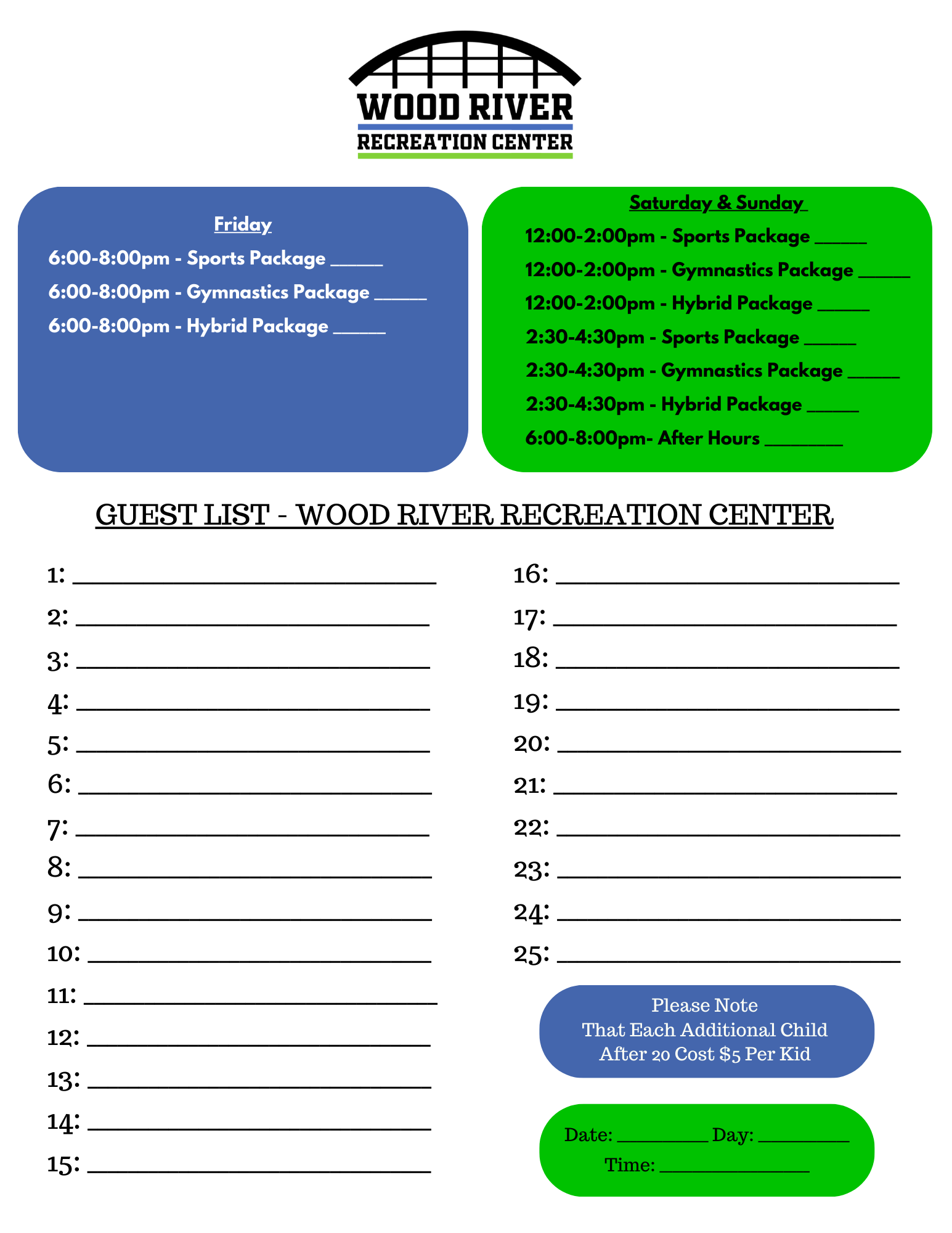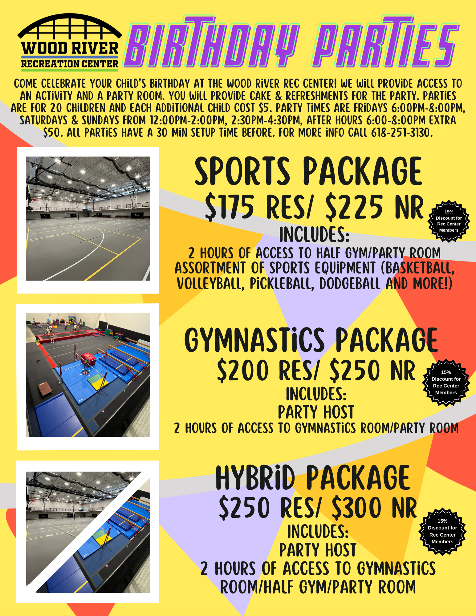 Come celebrate your child’s birthday at the Wood River Rec Center! We will provide access to an activity and a party room. You will provide cake & refreshments for the party. Parties are for 20 children and each additional child cost $5.