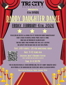Please join us for the Third Annual Tri-City Daddy Daughter Dance! Enjoy a night of dancing, dinner, prizes, crafts and more. Music will be provided by DJ Kirstan Gray. You will surely make memories that will last a lifetime!